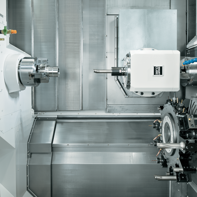 Thanks to the compact tool spindle “NT Smart Cube”, a wider machining area is ensured. By using the lower turret, it is applicable to simultaneous machining with upper/lower tools on L/R spindles as well as machining along with a turret center support.